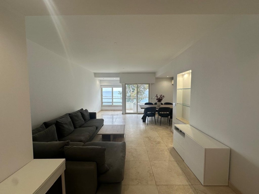 The apartment features a comfortable living area, a fully renovated kitchen with modern appliances, and plenty of natural light from the large windows that provide stunning sea views.