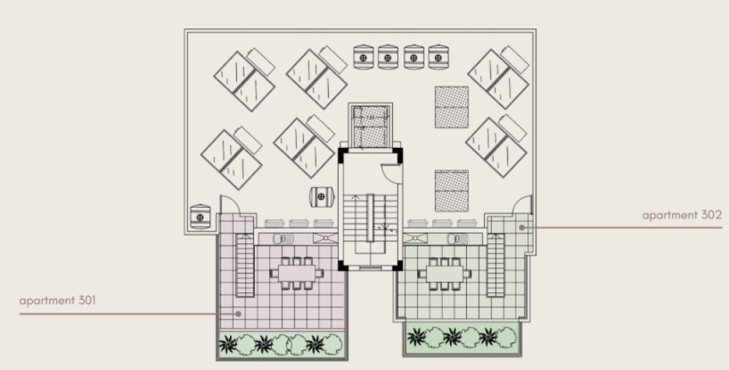 The property is complemented by landscaped outdoor areas, a secure entrance door for your peace of mind, and covered parking spaces for your convenience. Additionally, apartments No. 301 and 302 benefit from a roof garden with a BBQ and bar, offering an ideal space for relaxation and entertaining.